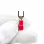 Terminal garfo / forquilha fabricado em material laminado, normalmente cobre estanhado ou latão estanhado.