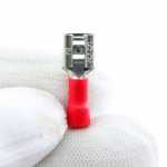 Terminal fêmea sem trava fabricado em material laminado, normalmente cobre estanhado ou latão estanhado.